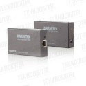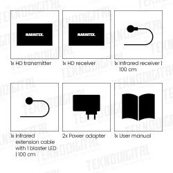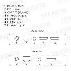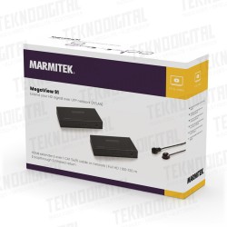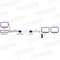 Il MegaView 91 consiste di un trasmettitore HDMI e un ricevitore HDMI. Il MegaView 91 è unico nel suo genere; puoi collegare ricevitori aggiuntivi (venduti separatamente) a un singolo trasmettitore HDMI. Ciò ti consente di estendere il segnale di un decoder (per es.), fino a 120 metri su singolo cavo CAT 5e/6, ad uno o più televisori (>10). Il decoder si collega al trasmettitore MegaView con un cavo HDMI, e il ricevitore MegaView si collega al (2°) televisore con un cavo HDMI. l trasmettitore e il ricevitore MegvaView sono collegati tra di loro tramite un solo cavo UTP.