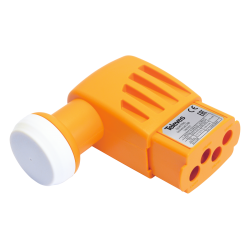Convertirore LNB quattro, con 4 uscite, ognuna con una combinazione di polarità/banda fissa (Ha, Hb, Va, Vb). Ogni uscita è segnata con un colore: nero per Vb, rosso per Va, giallo per Ha e verde per Hb.